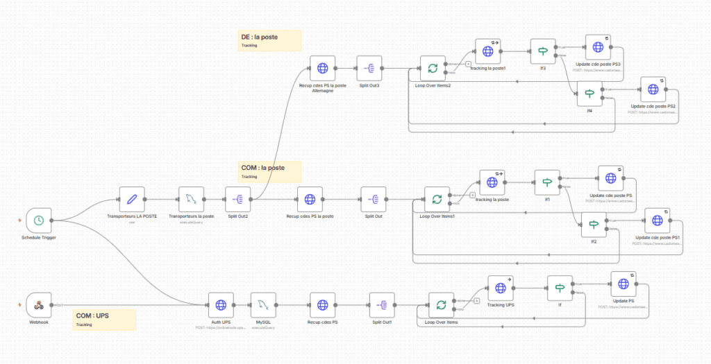 La deuxième grande branche traite La Poste. Ici, le workflow commence par une liste de références transporteurs définies dans un noeud Set. Ces références sont ensuite traduites en id_carrier actifs via une requête SQL. À partir de là, le workflow récupère les commandes associées, les découpe une par une, puis appelle l’API de suivi La Poste avec chaque shipping_number. Selon le code événement retourné, il peut soit passer la commande en livrée, soit la faire basculer dans un état spécifique avant livraison finale. C’est une logique plus fine que celle d’UPS, car plusieurs événements métier sont pris en compte.